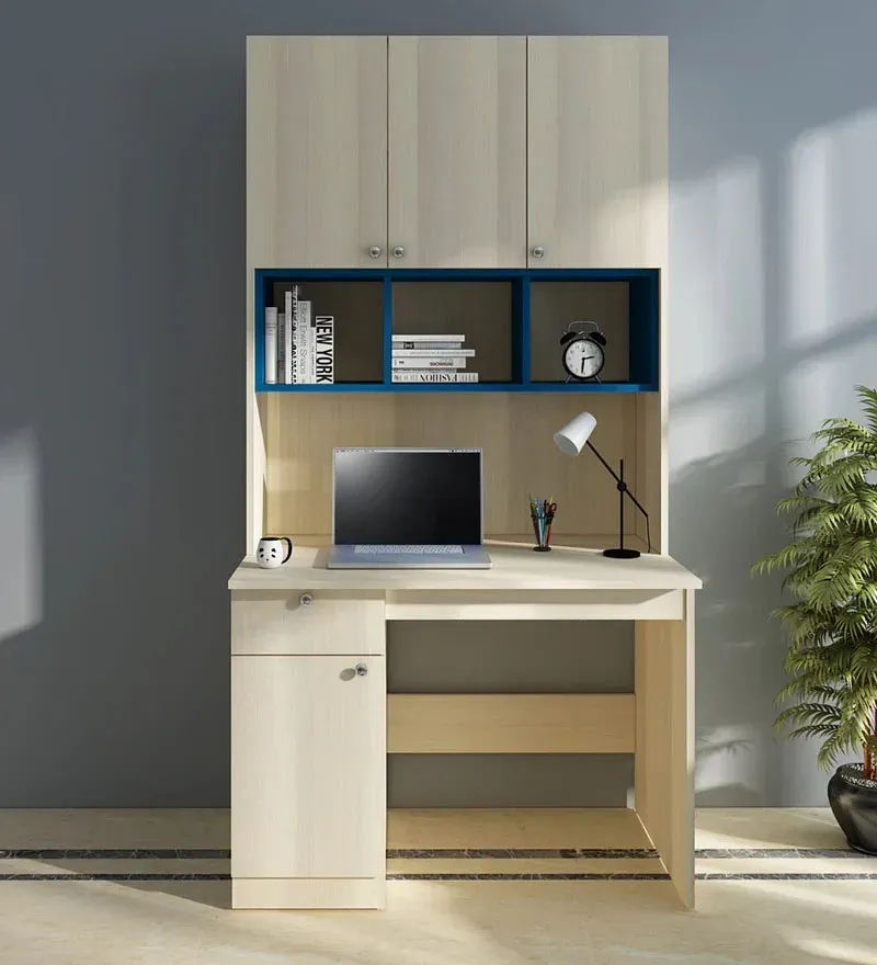 Fusion Hutch Cabinet In Beige Teak Blue Colour, Enhance your productivity and workspace aesthetics with our meticulously designed office table and chair set. Our thoughtfully crafted furniture will transform your office into a comfortable and efficient haven.The office table is a perfect blend of functionality and style. With a sleek and modern design, it complements any professional environment. The spacious surface provides ample room for your computer, paperwork, and other essential items. Built with durable materials, the table ensures long-lasting use and stability, even during the busiest workdays. Our office table design focuses on ergonomics and practicality. It features built-in storage compartments, cable management solutions, and convenient drawers, allowing you to keep your workspace organized and clutter-free. The thoughtfully placed openings and channels enable easy access to power outlets and ensure a tidy appearance. To complete your workspace, we offer an ergonomic office chair that prioritizes comfort and support. Designed with adjustable features, including height, lumbar support, and armrests, this chair provides customizable comfort tailored to your needs. Its sleek design and premium materials add a touch of elegance to your office while promoting proper posture and reducing strain on your body during long hours of work. Our office table and chair set are carefully crafted to withstand the demands of a busy work environment. The seamless integration of style and functionality will inspire creativity and boost your productivity.Upgrade your office space with our sophisticated office table and chair set. Experience the perfect combination of comfort, design, and efficiency. Order now and create an inspiring workspace that reflects your professionalism and personal style.