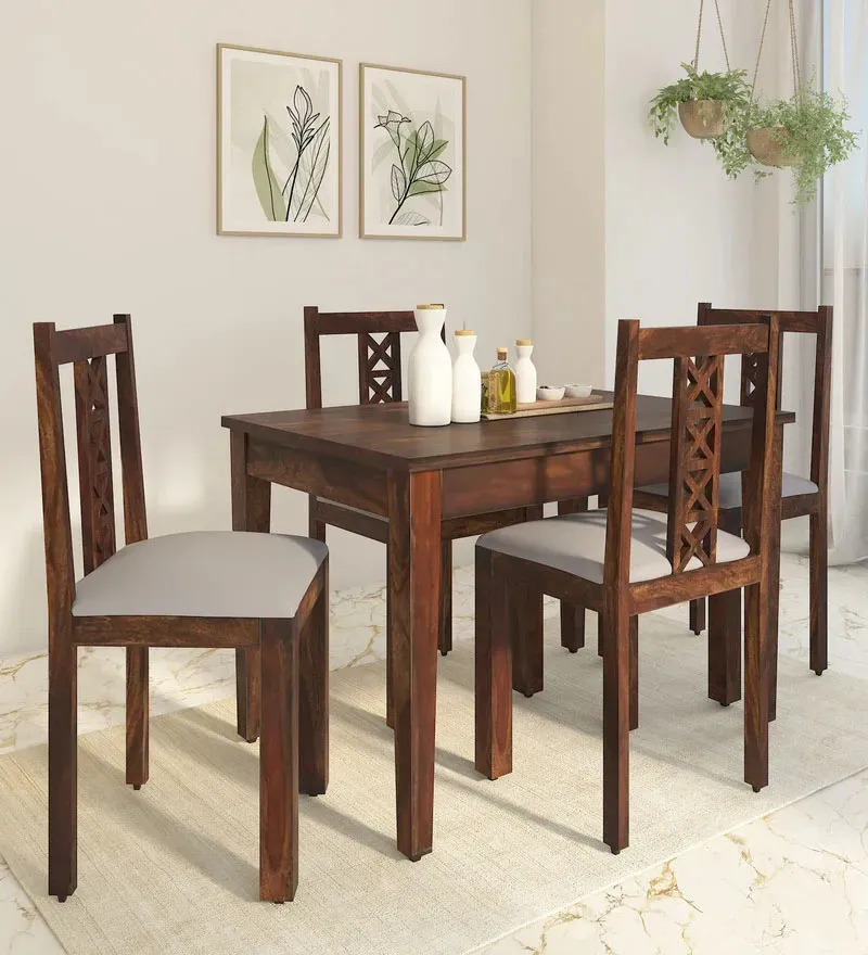 Kryss Sheesham Wood 4 Seater Dining Set In Provincial Teak Finish is a modern and stylish dining set that includes a table and four chairs. The set features a sleek charcoal-colored finish and is made from durable materials to ensure long-lasting use. The table has a rectangular shape and is supported by four sturdy legs, while the chairs have a comfortable upholstered seat and backrest. The dining set is perfect for small to medium-sized dining rooms or kitchens and can be easily matched with a variety of decor styles.