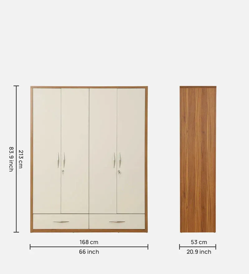 4 Door hinged MDF wardrobe with bottom drawer storage Color: High Gloss Cashmere Style: Contemporary & Modern.This wardrobe has internal 8 shelves with 1 drawer and 1 locker. Disclaimers: Accessories shown in the image are only for representation and are not part of the product. Depending on your screen settings and resolution on your device there may be a slight variance in fabric color and wood polish of the image and actual product. Wood grains will vary from product to product in case of solid wood furniture. Furniture having intricate hand-painted details are individual unique pieces and may have slight distinctions and variance between the picture and actual product. The Primary material is the main material used to manufacture the product and in addition to the primary material there might also be other type of materials used in the manufacturing of the product.