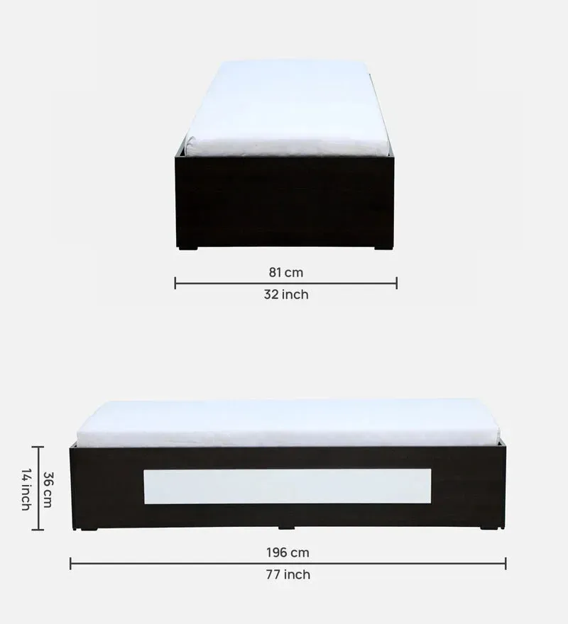 Notin Single Bed in Wenge Colour With Box Storage, Looking for a comfortable and stylish single bed that won't break the bank? Look no further than our updated single bed with storage, now available at an unbeatable price! Crafted from high-quality materials and designed for easy assembly with KD (knock-down) construction, this single bed is the perfect choice for anyone looking to upgrade their sleeping experience without spending a fortune. The compact size makes it ideal for smaller bedrooms or guest rooms, while the convenient storage compartments located beneath the bed provide ample space to keep your room tidy and organized. Measuring [insert single bed size], this bed offers plenty of space for a comfortable night's sleep. The sturdy frame is designed to provide maximum support, ensuring that you wake up feeling rested and refreshed. At Rs.8999/-, this bed is an unbeatable value. Whether you're looking to furnish your first apartment or upgrade your current sleeping situation, this single bed with storage is the perfect choice. With a volume of just 2 cubic meters, this bed is easy to transport and store, making it ideal for anyone who needs to move frequently or wants the flexibility to change up their space. Plus, with a fast delivery time of just 7 day, you can start enjoying your new single bed in no time.