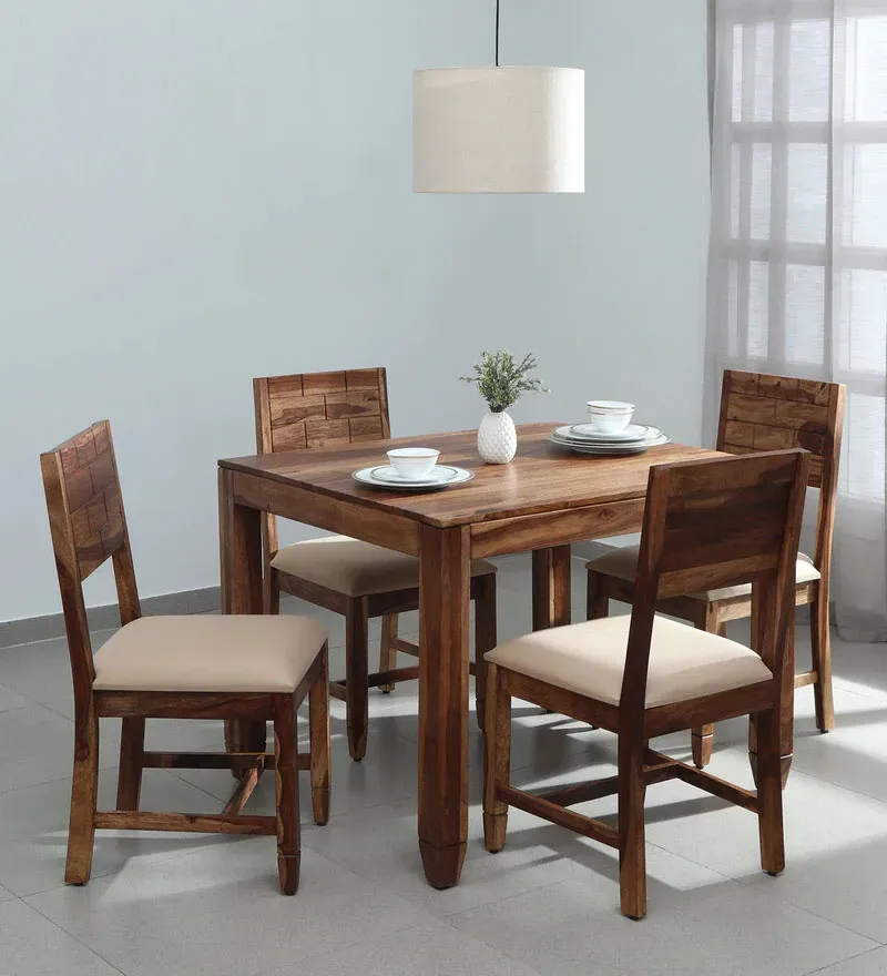 Rezzan Sheesham Wood 4 Seater Dining Set In Rustic Teak Finish is a modern and stylish dining set that includes a table and four chairs. The set features a sleek charcoal-colored finish and is made from durable materials to ensure long-lasting use. The table has a rectangular shape and is supported by four sturdy legs, while the chairs have a comfortable upholstered seat and backrest. The dining set is perfect for small to medium-sized dining rooms or kitchens and can be easily matched with a variety of decor styles.