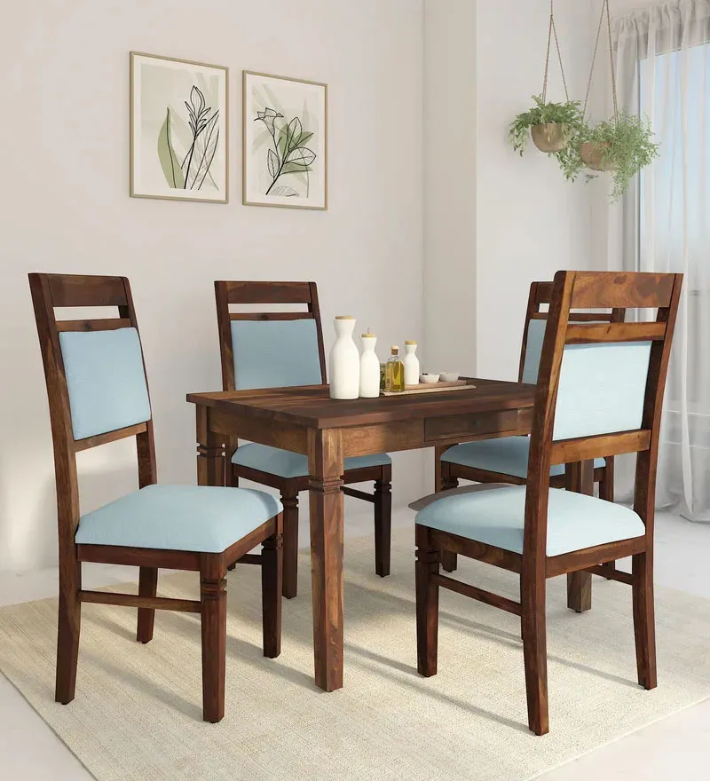 Warsaw Sheesham Wood 4 Seater Dining Set (Groove Legs) In Provincial Teak Finish is a modern and stylish dining set that includes a table and four chairs. The set features a sleek charcoal-colored finish and is made from durable materials to ensure long-lasting use. The table has a rectangular shape and is supported by four sturdy legs, while the chairs have a comfortable upholstered seat and backrest. The dining set is perfect for small to medium-sized dining rooms or kitchens and can be easily matched with a variety of decor styles.