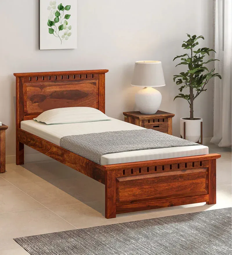 Zurndorf Sheesham Wood Single Bed In Honey Oak Finish, Looking for a comfortable and stylish single bed that won't break the bank? Look no further than our updated single bed with storage, now available at an unbeatable price! Crafted from high-quality materials and designed for easy assembly with KD (knock-down) construction, this single bed is the perfect choice for anyone looking to upgrade their sleeping experience without spending a fortune. The compact size makes it ideal for smaller bedrooms or guest rooms, while the convenient storage compartments located beneath the bed provide ample space to keep your room tidy and organized. Measuring [insert single bed size], this bed offers plenty of space for a comfortable night's sleep. The sturdy frame is designed to provide maximum support, ensuring that you wake up feeling rested and refreshed. At Rs.8999/-, this bed is an unbeatable value. Whether you're looking to furnish your first apartment or upgrade your current sleeping situation, this single bed with storage is the perfect choice. With a volume of just 2 cubic meters, this bed is easy to transport and store, making it ideal for anyone who needs to move frequently or wants the flexibility to change up their space. Plus, with a fast delivery time of just 7 day, you can start enjoying your new single bed in no time. Upgrade your sleeping experience with our updated single bed with storage. Order yours today and discover the perfect blend of comfort, convenience, and affordability!